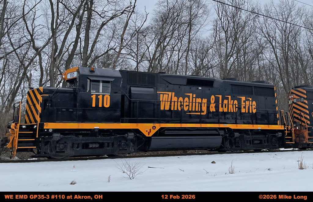 Painted in former KCS gray with yellow diagonal stripes on the short hood and yellow frame striping, with small black Wheeling & Lake Erie lettering under the cab and black numbers on the cab sides, as well as American flag decals on the battery box on each side. Has also received yellow reflective frame stripes. Painted in former KCS gray with yellow diagonal stripes on the short hood and yellow reflective frame striping, with small black Wheeling & Lake Erie lettering under the cab and black numbers on the cab sides. Unit was used by 20th Century Fox in the filming of the movie "Unstoppable" and was specially painted in fictional AWVR gray, yellow and black scheme during that time. Has since been renumbered and repainted for WE. Unit was used by 20th Century Fox in the filming of the movie "Unstoppable" and was specially painted in fictional AWVR blue, yellow and black scheme. Has since been renumbered and repainted for WE. Painted in special red, white, blue, black, and gold scheme to celebrate 250 years of independence for our nation. Unit has the name "J. J. Gonzales" painted on each side of the low short hood. Equipped with 102" "snoot" low short hood. Unit is painted in former BNSF dark green and orange, with yellow striping, and black road numbers, as well as white "WE" letters under the cab on each side. Painted in former FURX green, silver, and black with white stripes, white cab road number and Wheeling & Lake Erie lettering below the cab. Painted in CITX gray and black with blue stripes, white frame stripe, with small black Wheeling & Lake Erie lettering under the cab + black numbers on the cab sides. Painted in CITX gray and black with white front striping, yellow frame stripes, with small black Wheeling & Lake Erie lettering under the cab + black numbers on the cab sides. Painted in former CITX/GCFX green, silver, and black with white stripes, white cab road number and Wheeling & Lake Erie lettering below the cab. Painted in CEFX blue and black with white striping, lettering and numbers, and white "Smartsand" logo on the engine compartment. Unit received white cab road number and Wheeling & Lake Erie lettering below the cab. Painted in CEFX blue and black with white striping, lettering, and numbers. Unit received white cab road number and Wheeling & Lake Erie lettering below the cab. Painted in former UP yellow/gray with red stripe, with small black Wheeling & Lake Erie lettering under the cab + black numbers on the cab sides, and red/white end striping. Equipped for Positive Train Control (PTC). Painted with commemorative W&LE 30-Year Logo on each side of long hood. Unit has a vertical 50th Anniversary Operation Lifesaver logo applied to the hood sides. Unit has a horizontal 50th Anniversary Operation Lifesaver logo applied to the battery box doors. Painted in CITX gray and black with yellow frame stripes, with small black Wheeling & Lake Erie lettering under the cab + black numbers on the cab sides. Front of the low short hood repainted in primer gray. |